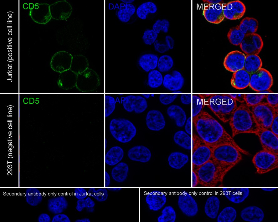 Immunocytochemistry analysis of Jurkat (positive) and 293T (negative) labeling Human CD5 with Rabbit anti-Human CD5 antibody (HA722210) at 1/100 dilution.