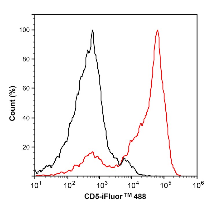 Cells were fixed in 4% paraformaldehyde for 20 minutes at room temperature, permeabilized with 0.1% Triton X-100 in PBS for 5 minutes at room temperature, then blocked with 1% BSA in 10% negative goat serum for 1 hour at room temperature. Cells were then incubated with Rabbit anti-Human CD5 antibody (HA722210) at 1/100 dilution in 1% BSA in PBST overnight at 4 ℃. Goat Anti-Rabbit IgG H&L (iFluor™ 488, HA1121) was used as the secondary antibody at 1/1,000 dilution. PBS instead of the primary antibody was used as the secondary antibody only control. Nuclear DNA was labelled in blue with DAPI.