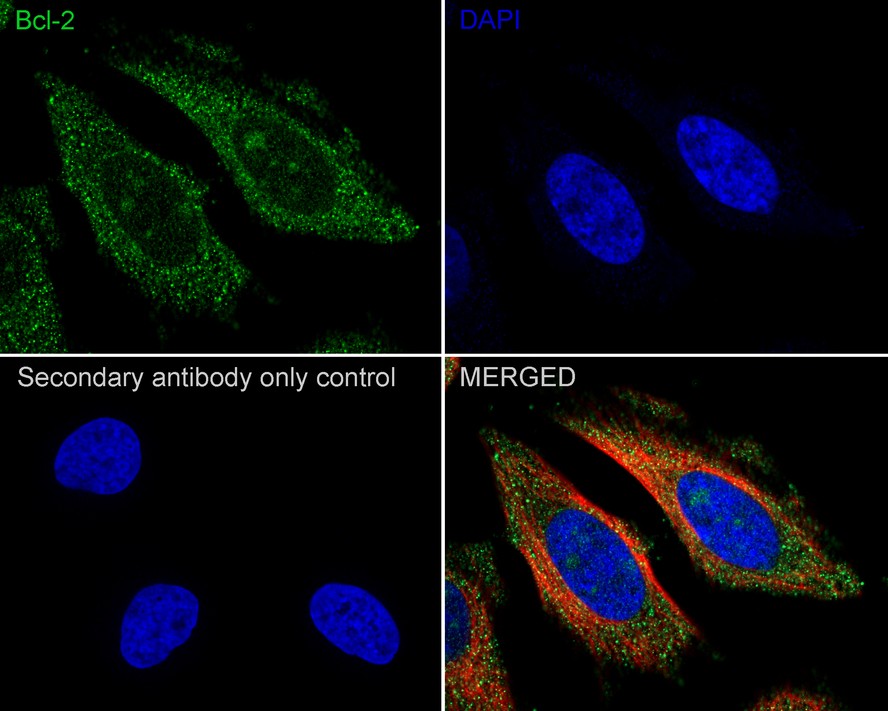 Cells were fixed in 4% paraformaldehyde for 20 minutes at room temperature, permeabilized with 0.1% Triton X-100 in PBS for 5 minutes at room temperature, then blocked with 1% BSA in 10% negative goat serum for 1 hour at room temperature. Cells were then incubated with Rabbit anti-Bcl-2 antibody (HA721235) at 1/100 dilution in 1% BSA in PBST overnight at 4 ℃. Goat Anti-Rabbit IgG H&L (iFluor™ 488, HA1121) was used as the secondary antibody at 1/1,000 dilution. PBS instead of the primary antibody was used as the secondary antibody only control. Nuclear DNA was labelled in blue with DAPI.