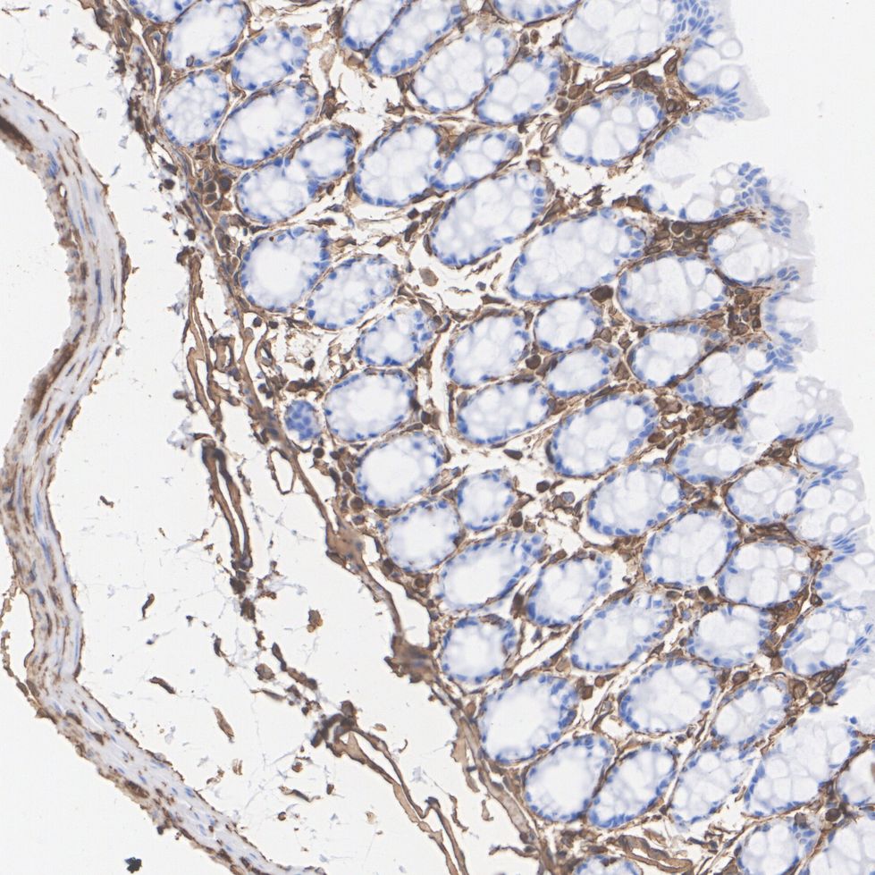Vimentin (57 kDa) is the most ubiquituos intermediate filament protein and the first to be expressed during cell differentiation. All primitive cell types express vimentin but in most non-mesenchymal cells it is replaced by other intermediate filament proteins during differentiation. Vimentin is expressed in a wide variety of mesenchymal cell types: fibroblasts, endothelial cells etc., and in a number of other cell types derived from mesoderm, e.g., mesothelium and ovarian granulosa cells. Vimentin is present in many different neoplasms but is particulary expressed in those originated from mesenchymal cells. Sarcomas e.g., fibrosarcoma, malignt fibrous histiocytoma, angiosarcoma, and leio- and rhabdomyosarcoma, as well as lymphomas, malignant melanoma and schwannoma, are virtually always vimentin positive. Mesoderm derived carcinomas like renal cell carcinoma, adrenal cortical carcinoma and adenocarcinomas from endometrium and ovary usually express vimentin. Also thyroid carcinomas are vimentin positive. Any low differentiated or sarcomatoid carcinoma may express some vimentin. Vimentin is frequently included in the so-called primary panel (together with CD45, cytokeratin, and S-100 protein): Intense staining reaction for vimentin without coexpression of other intermediate filament proteins is strongly suggestive of a mesenchymal tumour or a malignant melanoma. However, in biopsies representing only a sarcomatoid part of renal cell carcinoma a.o. a strong positivity for vimentin without cytokeratin expression may be seen. Tumours like lymphomas and seminomas have the same intermediate filament profile, but the vimentin expression is usually weaker.